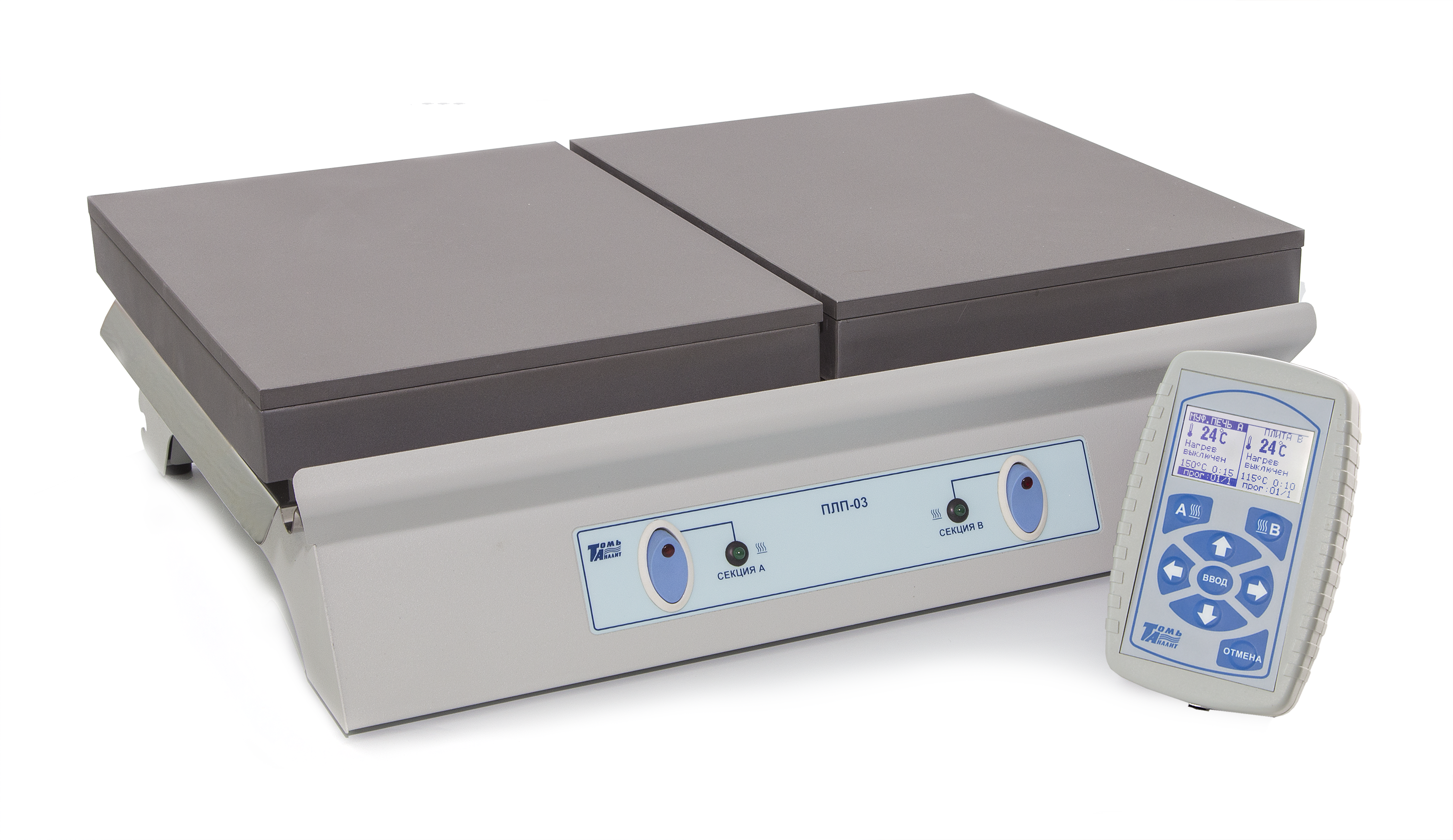 Плита нагревательная лабораторная программируемая ПЛП-03 имеет две секции нагрева. Каждая секция нагрева может работать отдельно или совместно. Температура нагрева секций и время поддержания температуры нагрева задаются оператором.