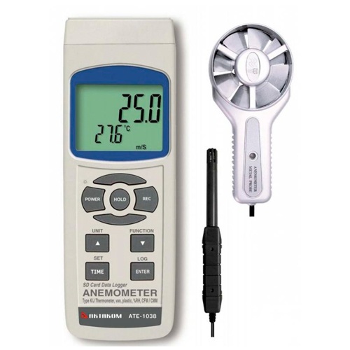 Портативный анемометр АТЕ-1038 является комбинированным прибором для измерения параметров воздушного потока, температуры и относительной влажности окружающей среды, температуры контактным методом при помощи термопар. Прибор снабжен усиленной металлической крыльчаткой с шарикоподшипниками низкого трения, которая позволяет проводить измерения даже при больших скоростях воздушного потока (до 35 м/с). Помимо измерения скорости и температуры потока воздуха, прибор позволяет вычислять объем проходящего через крыльчатку воздуха, а внешний датчик влажности делает возможным вычисления точки росы и температуры смоченного термометра. АТЕ-1038 может подключаться к компьютеру, а, кроме того, имеется возможность сохранения измеренных данных на карту SD в формате Excel в режиме реального времени без использования специального программного обеспечения.